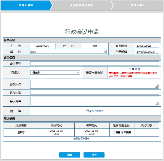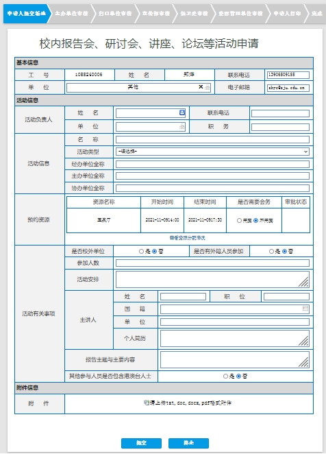 方式二:报告会、论坛、讲座等活动,表格填写。申请此类型的会议形式必须经过主办单位审核、归口单位审核、宣传部审核、保卫处审核、资源管理单位审核,全部通过方可使用场馆。