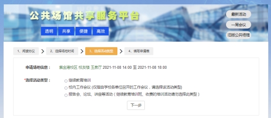 4.选择活动类型。方式一:校内工作会议。方式二:报告会、论坛、讲座等活动。