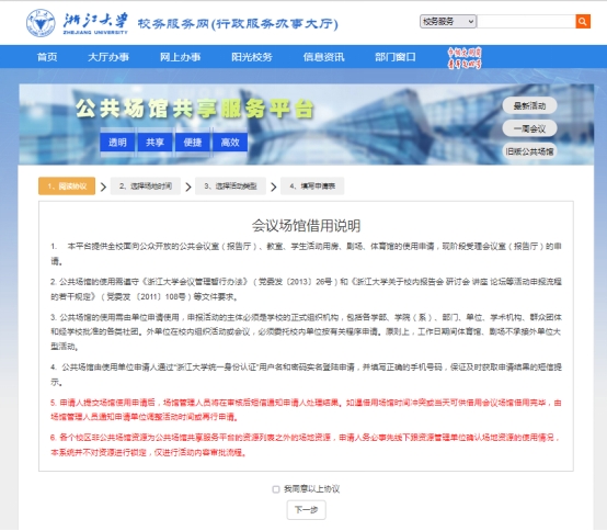 5.会场申请完成可在点击主页右上方橙色字“网上办事工作台”查看申请的会议信息。
