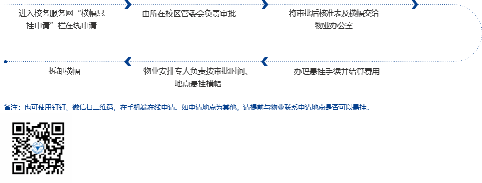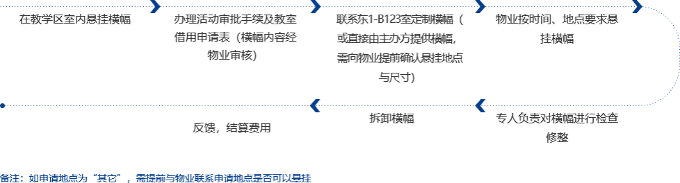 校区管委会审批→申请表交物业办公室备案→定制横幅(或直接由主办方提供横幅)→将审批后的表格及横幅拿到物业办公室办理悬挂手续并结算费用→专人负责按审批时间、地点悬挂横幅→拆卸横幅
