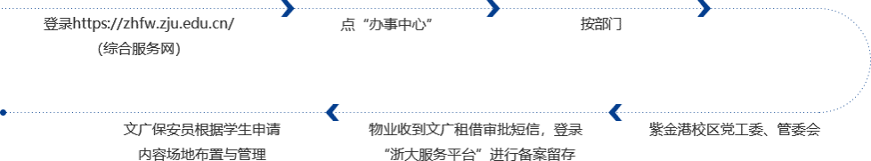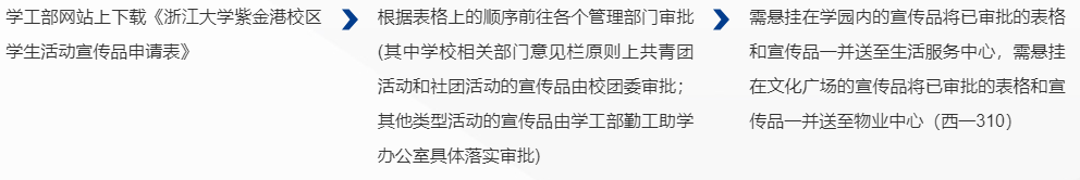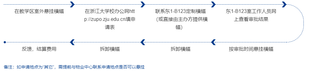《浙江大学横幅等悬挂审批》(校区管委会盖章)—→审批表、横幅交教学楼一楼值班室(或委托物业定制横幅)—→费用结算—→按审批时间、地点悬挂横幅—→悬挂时间到期拆卸横幅”