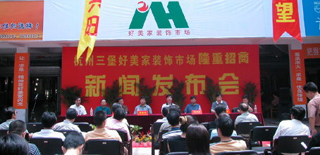 6月25日上午,由后勤集团和杭州三堡股份经济合作社共同开发创办的杭州三堡好美家装饰市场在该市场南楼展销大厅举行了招商新闻发布会。这标志着好美家装饰市场进入了前期运行阶段,也标志着省内规模最大、设施最先进、功能最齐全、管理最现代化的装饰商城在杭州城第一次公开亮相。