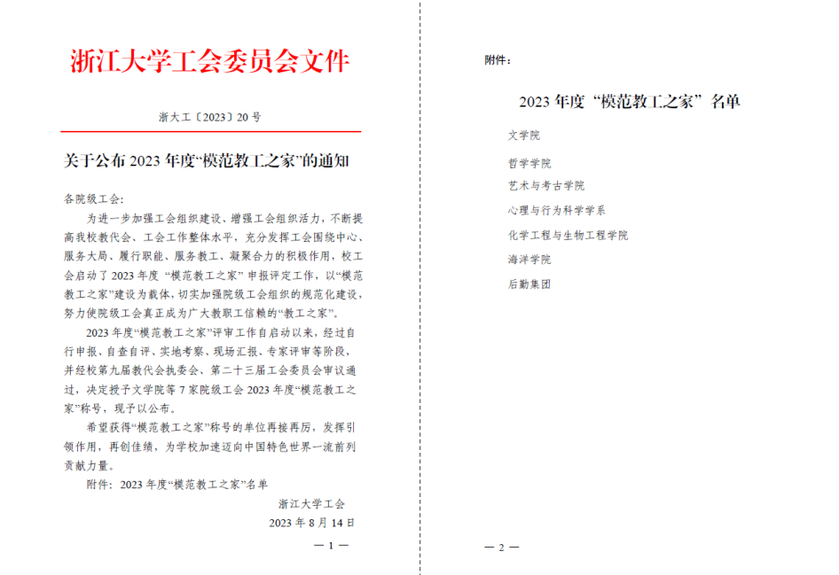 在浙江大学2023年教代会、工会干部暑期培训会议上,后勤集团工会被授予2023年度“模范教工之家”称号。2023 年度“模范教工之家”评审工作自启动以来,经过自行申报、自查自评、组织评委实地考察、申报单位的工会负责人工作汇报、专家评审等阶段,并经校第九届教代会执委会、第二十三届工会委员会审议通过后予以公布,共有7家单位获此荣誉。