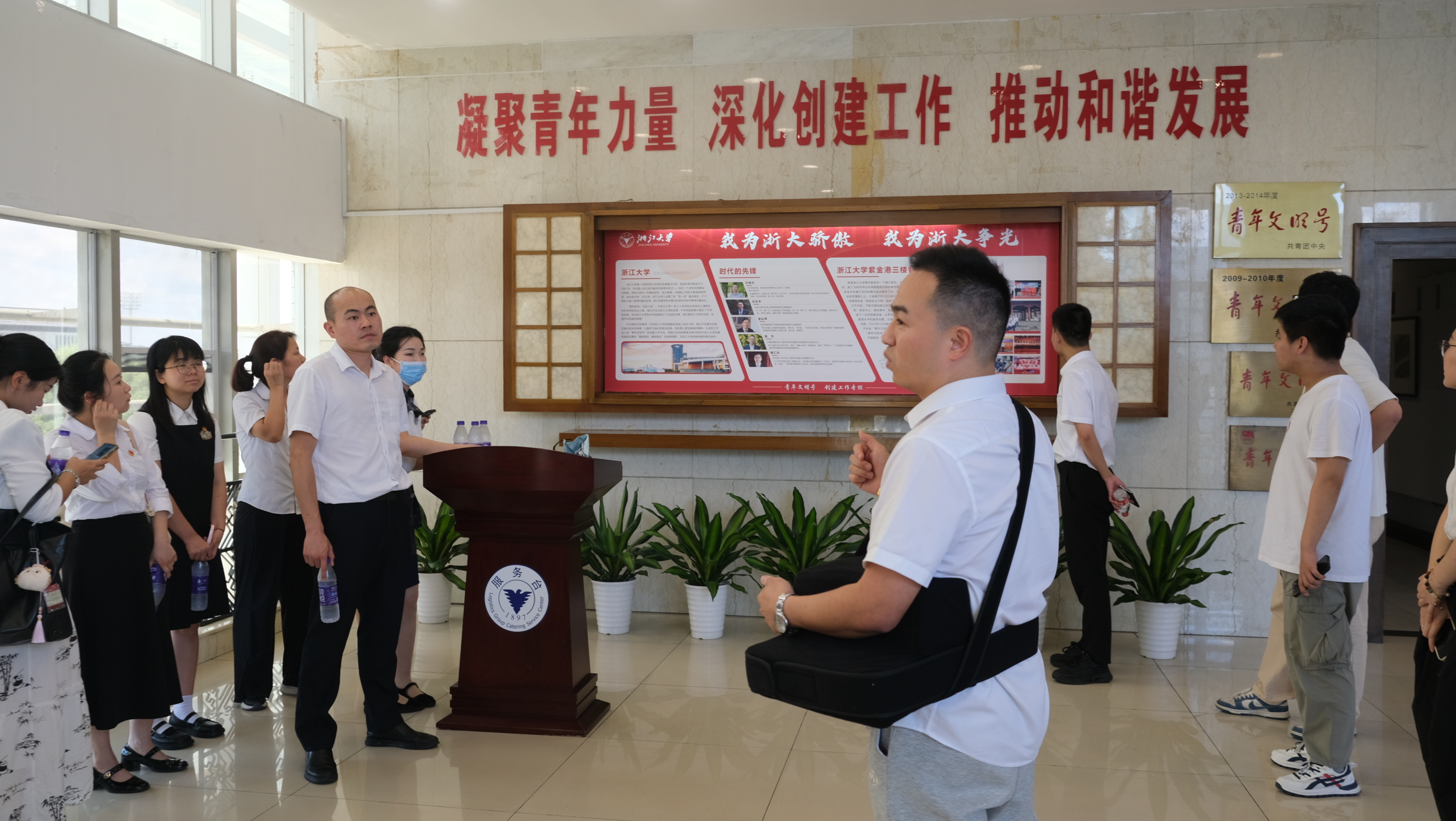 上午,双方交流人员一同走访了杭州市水务集团下属环科设计公司监测中心检验分析科,参观了国家城市排水监测网杭州监测站实验室、技能大师工作室等,实地了解供排水水质监测设施设备和日常工作内容,该部门承担着保障城市供排水水质安全的重要职责,曾获评2020-2021年度省级“青年文明号”。随后,交流人员前往浙江大学紫金港校区,在求是大讲堂参观了后勤集团会务中心浙江大学校级“青年文明号”和紫金港校区大食堂三楼餐厅国家级“青年文明号”,了解学习了会务板块与餐饮板块的服务保障标准化管理,体验感受了后勤集团“青年文明号”集体创建的浓厚氛围。