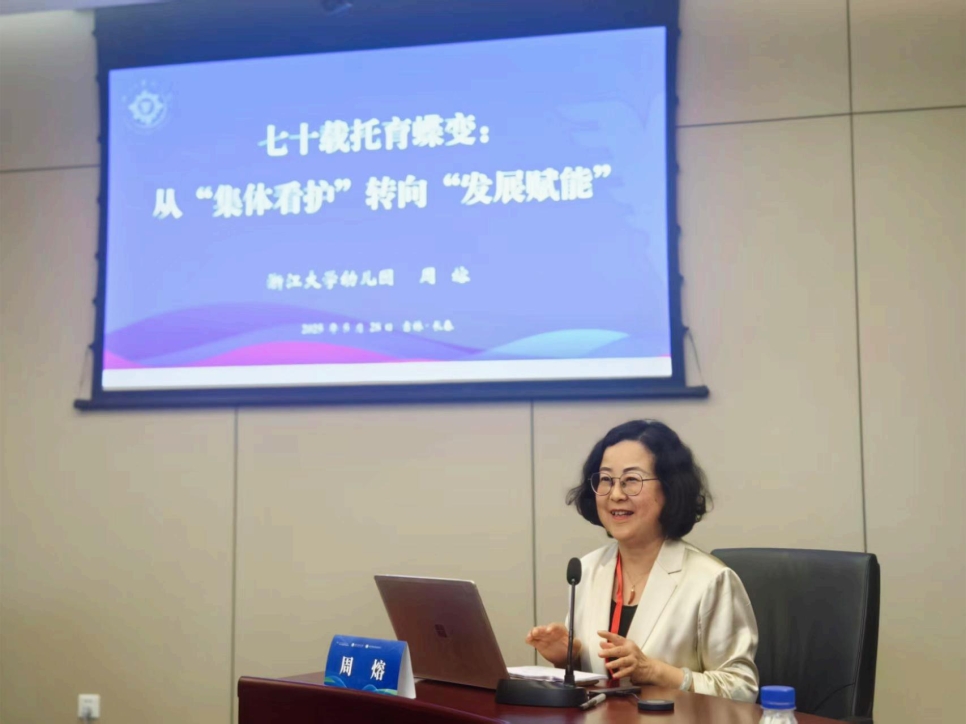 周熔园长以《七十载托育蝶变:从“集体看护”转向“发展赋能”》为题,着重分享了72年来浙江大学幼儿园托育服务的时代转向和实践行动。在国家“构建生育友好型社会”顶层设计的时代背景下,浙大幼儿园在学术研究、师幼关系、空间环境、日常照护、早期学习等五个方面进行了实践探索,为儿童发展赋能,着力构建“研究引领-实践优化-国际协同”托育发展模式。