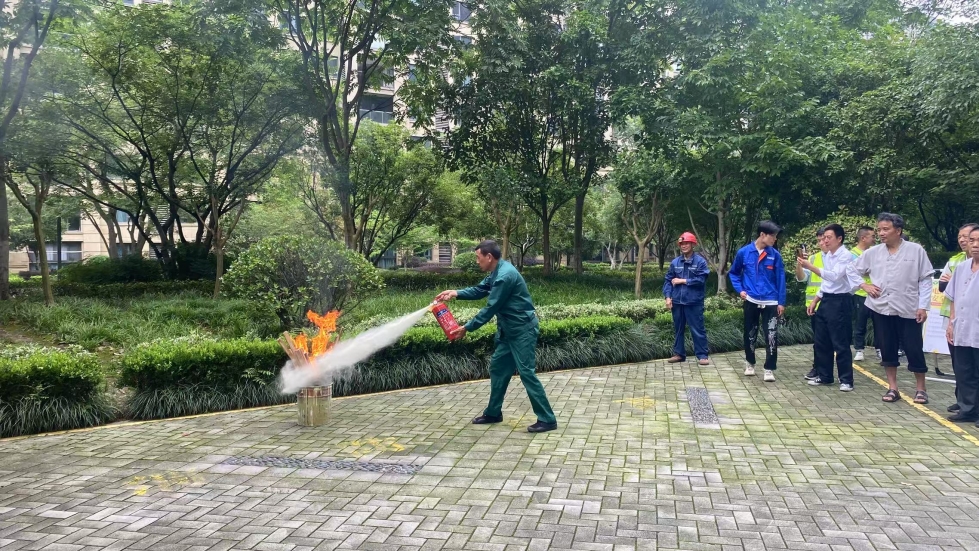 活动当日,项目部全体员工在小区空地整齐列队,以饱满的热情迎接这场“安全大练兵”。演练的第一个环节便是灭火器的操作。从压力表状态判断到喷射角度把控,专业人员都细致讲解并示范操作要领。员工们全神贯注,认真观摩学习,不少人还拿出手机拍摄记录关键步骤。