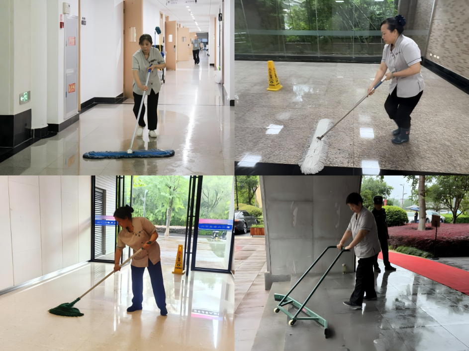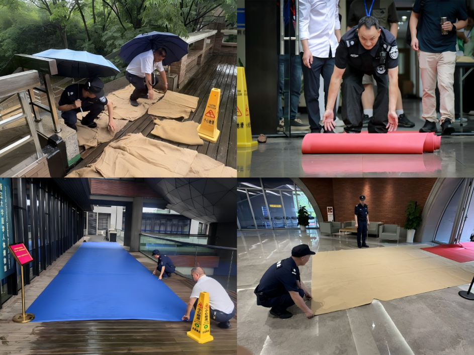 考试当天,大雨不期而至,但各校区突击队员们丝毫没有被打乱保障节奏。清晨6点,紧张的工作已然展开。在党员干部的带领下,突击队员们全面巡查,逐一排查安全隐患,在室外及时清理路面积水,在室内加强循环保洁,以实际行动为考试筑牢安全防线。