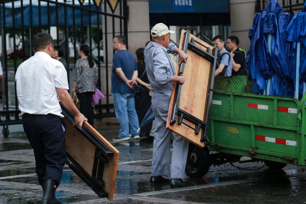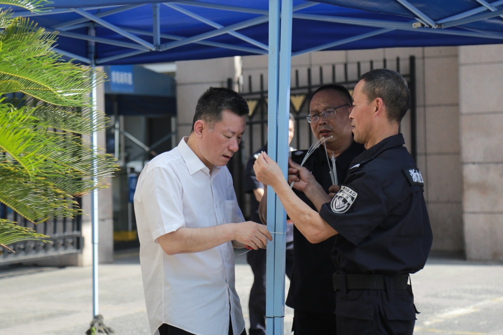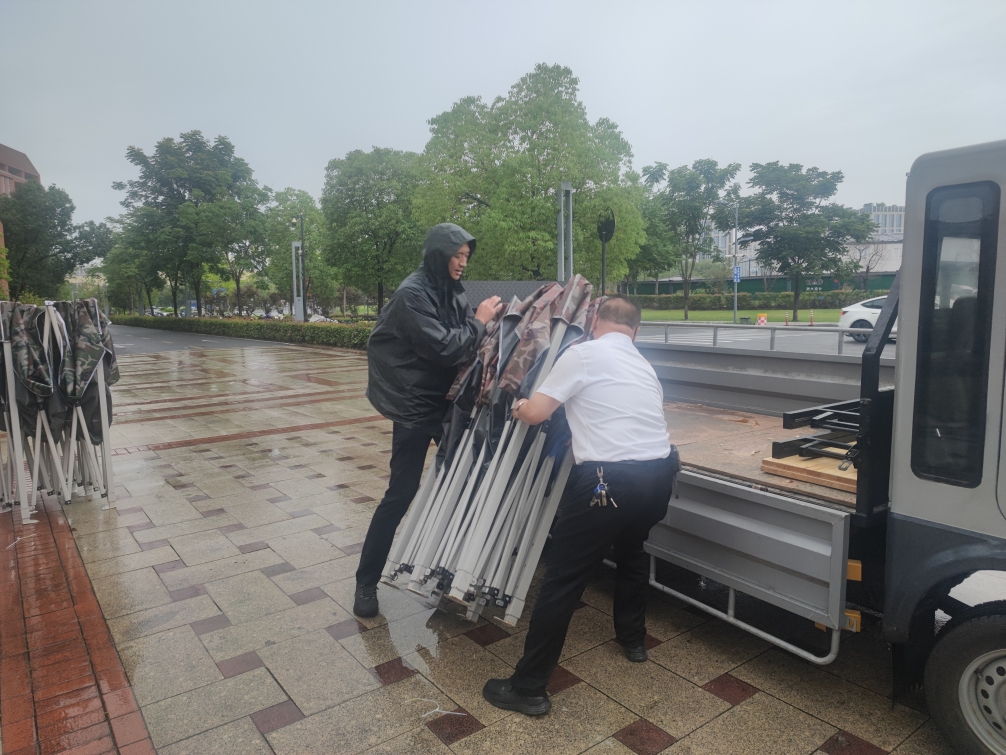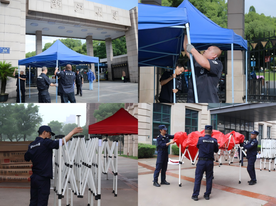 考试期间正值梅雨季节,为应对降雨天气影响,求是物业细致考虑,提前应对,在三校区累计搭建帐篷170余顶,并采用沙袋、扎带等工具进行加固,确保考生出入安全。同时,在各楼宇入口处铺设防滑垫、摆放防滑提示牌,在细节之处尽显温馨关怀。