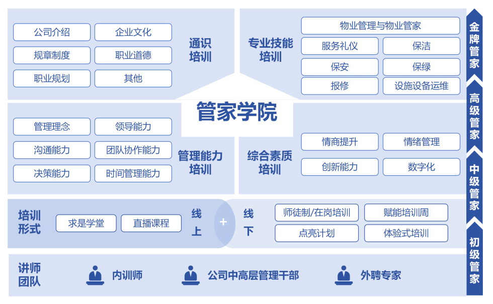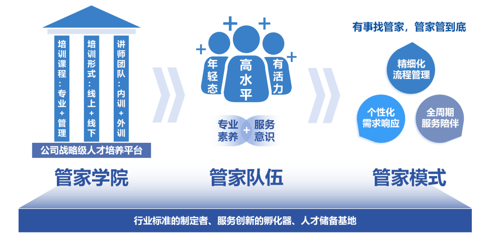 基于物业行业精细化、专业化、智能化的发展趋势,为满足公司“三支队伍”人才梯队建设需求,推进物业服务品质持续提升,“管家学院”应运而生。作为公司战略级人才培养平台,“管家学院”将以“行业标准制定者、服务创新孵化器、人才储备基地”为定位,助推公司多元业态一体发展,为公司高质量发展提供持续的人才动力。