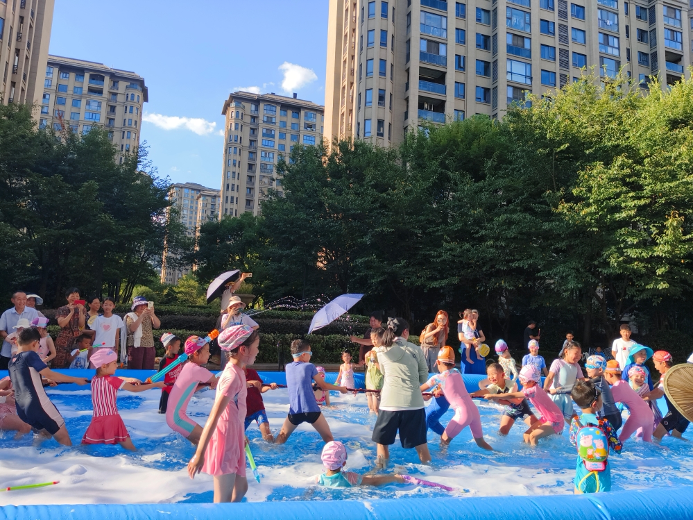 活动现场欢乐满溢。小业主们迫不及待地冲进“泡泡海洋”,嬉戏打闹,笑声不断。为了让活动更具互动性,项目部今年特别增设了一场拔河比赛。与众不同的是,这场拔河比赛直接在泡泡泳池中举行,湿滑的池底让比赛更添趣味与挑战。随着裁判一声令下,两队小朋友立刻进入比赛状态,一边努力保持平衡,一边用力拉绳子,现场氛围紧张热烈。家长们虽未下水,但也享受其中,不仅在一旁为孩子们加油助威,还纷纷拿出手机记录下这一幕幕欢乐瞬间。