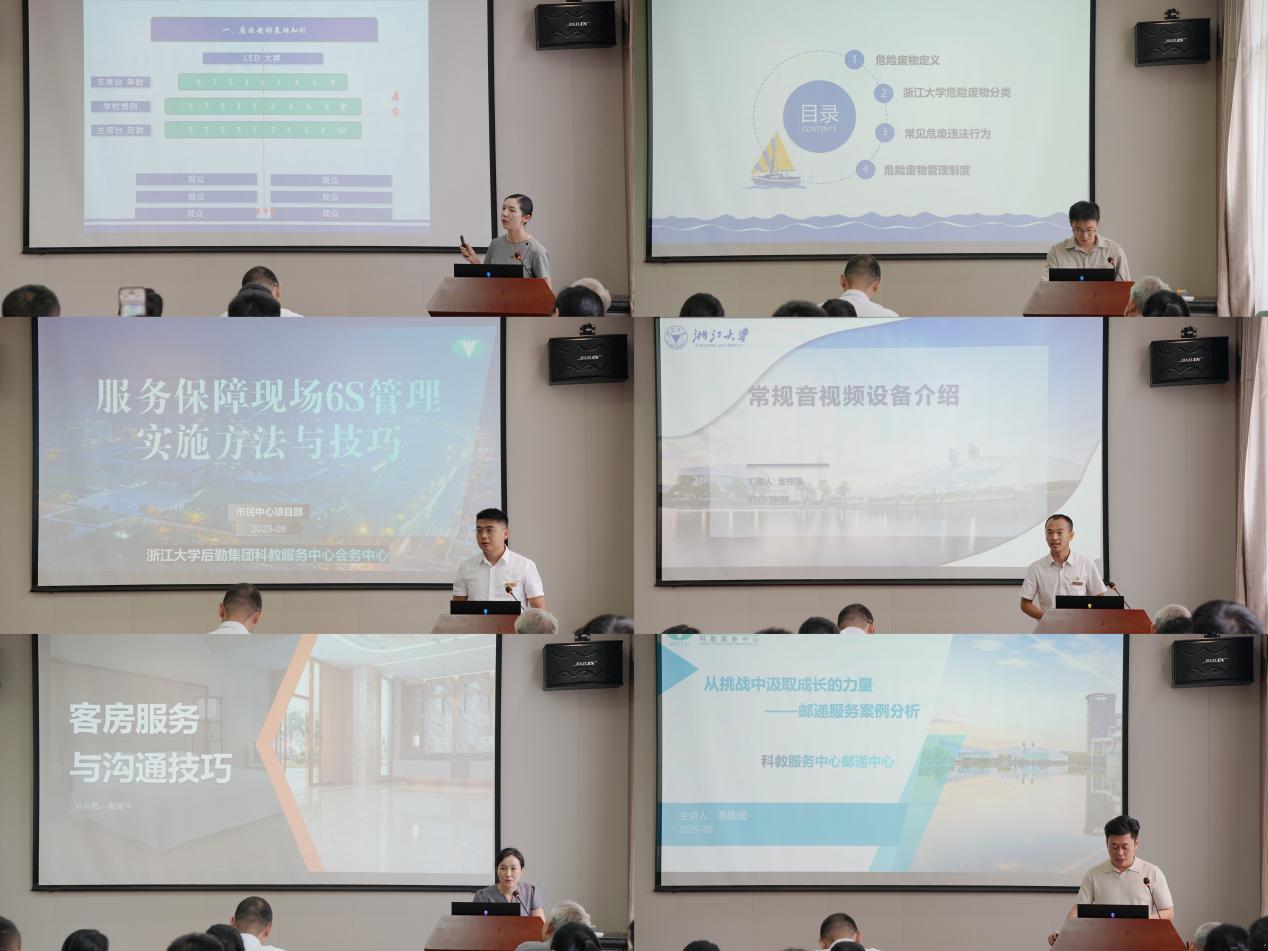 活动中,各部门推荐的6名内训师候选人依次登台,围绕各自专业领域的课程进行试讲。课程内容涵盖客房服务与沟通技巧、化废中转站危险废物管理措施、会场类型与座次安排、常规音视频介绍、服务保障6S现场管理实施方法与技巧、邮递服务案例分析等多个实务主题。每位候选人从课程设计初衷、培训目标、总体框架等方面进行阐述,并选取重点章节进行15分钟内的试讲,充分展现了其专业功底与授课能力。