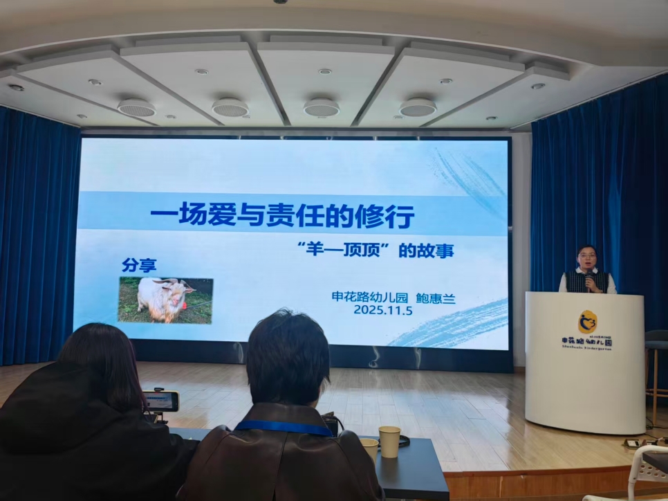 鲍慧兰老师分享的《一场爱与责任的修行》更是满含温情,令人动容。幼儿园的“羊顶顶”,从初入园中被孩子们轮流照料到专属婚礼童趣满满,再到晚年温情相伴,直至最后告别时刻的生命之课。这一路的长程学习,尽显班级特色活动与陪伴式教育的变革智慧,串联起责任、共情与生命认知的完整教育链条。