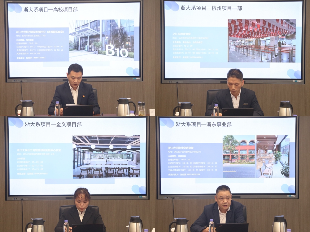 会上,公司浙大系项目各食堂主任围绕师生满意度、经营服务情况、甲方管理要求等多个方面,分别对各自项目的基本运营情况进行了系统汇报,详细介绍了当前工作中取得的成绩、面临的主要问题与实际困难,并就师生反馈的意见进行了梳理和分析。随后,各项目经理汇报了进一步提升食堂综合服务水平的改进措施与具体工作计划。