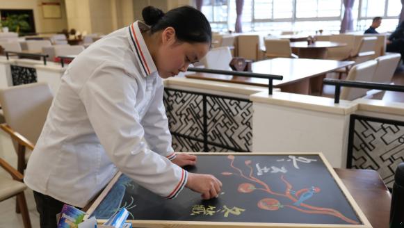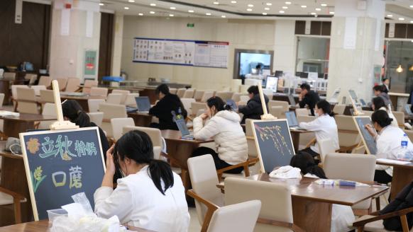 来自各组团及校区食堂的11支员工队伍同台竞技。各名选手迅速进入创作状态。黑板报创作区,选手们有的以简约线条勾勒节气菜品,将“饺子煨鸡”“山药玉米炖排骨”等菜品与节气特征巧妙融合;有的用浓墨重彩渲染传统韵味,让菜品介绍在笔墨书香中更显雅致。电子海报创作区,选手们熟练操作设计软件,精准呈现食堂招牌菜的色泽纹理、食材搭配,有的以卡通形象增添趣味性,有的以简约排版突出信息点,一幅幅作品兼具视觉美感与信息传达力。