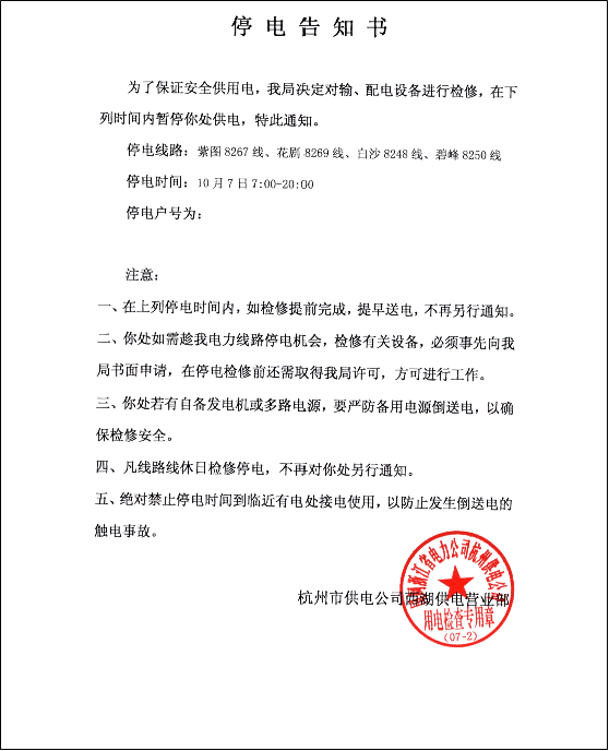 特别提示:在停电过程中,设计有双路供电的单位短时有主副电源停电切换过程(不同时段有二次以上停电,所以请在本通知停电时间内最好不要用电),需注意设备安全。请各单位提前做好停电前的准备工作(特别注意锁上电梯),电脑提前关机,实际恢复供电时间不另行通知,停电期间严禁触摸用电设备,以防发生意外。请物业管理公司做好恢复供电后分配电柜的合闸工作(否则会延误有关单位用电)