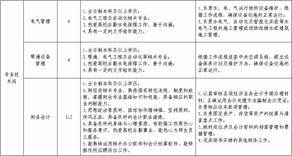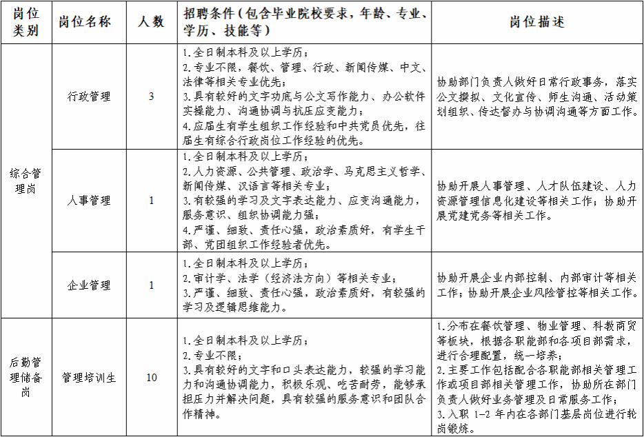 本次招聘的储备干部主要包括综合管理岗、后勤管理储备岗、专业技术岗等三类。岗位名称及具体岗位要求附后。