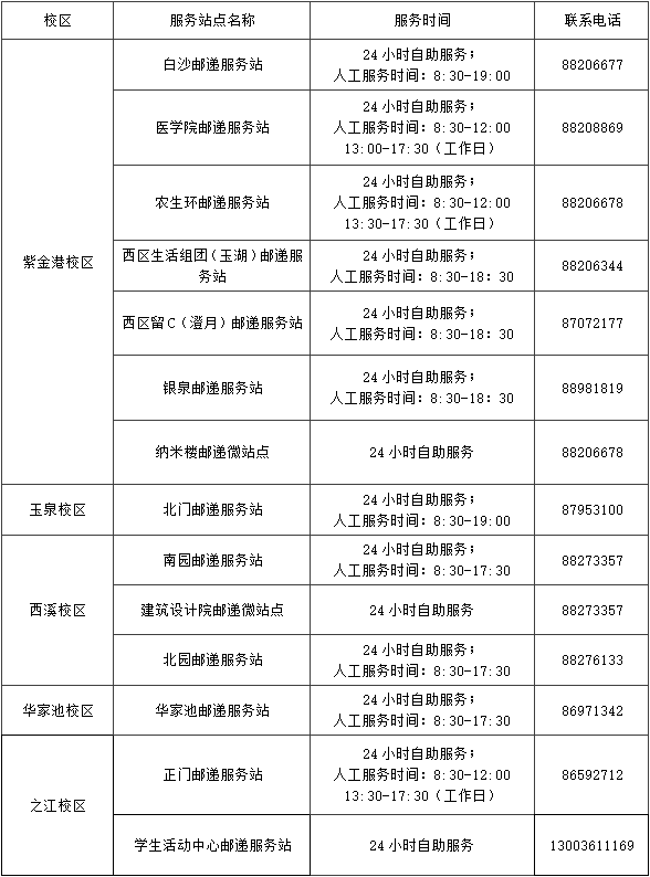 各校区邮递服务站信息