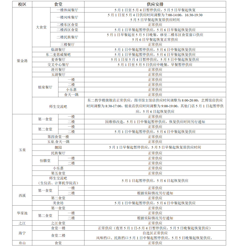 备注:1.校园卡服务部5月1日至5月5日暂停服务,5月6日起正常提供服务。假期咨询电话:紫金港校区0571-88206557,玉泉校区0571-87951505,西溪校区0571-88273662,华家池校区0571-86971023;诉求反馈专线0571-88206502。2.饮食服务中心值班电话:0571-88206318。