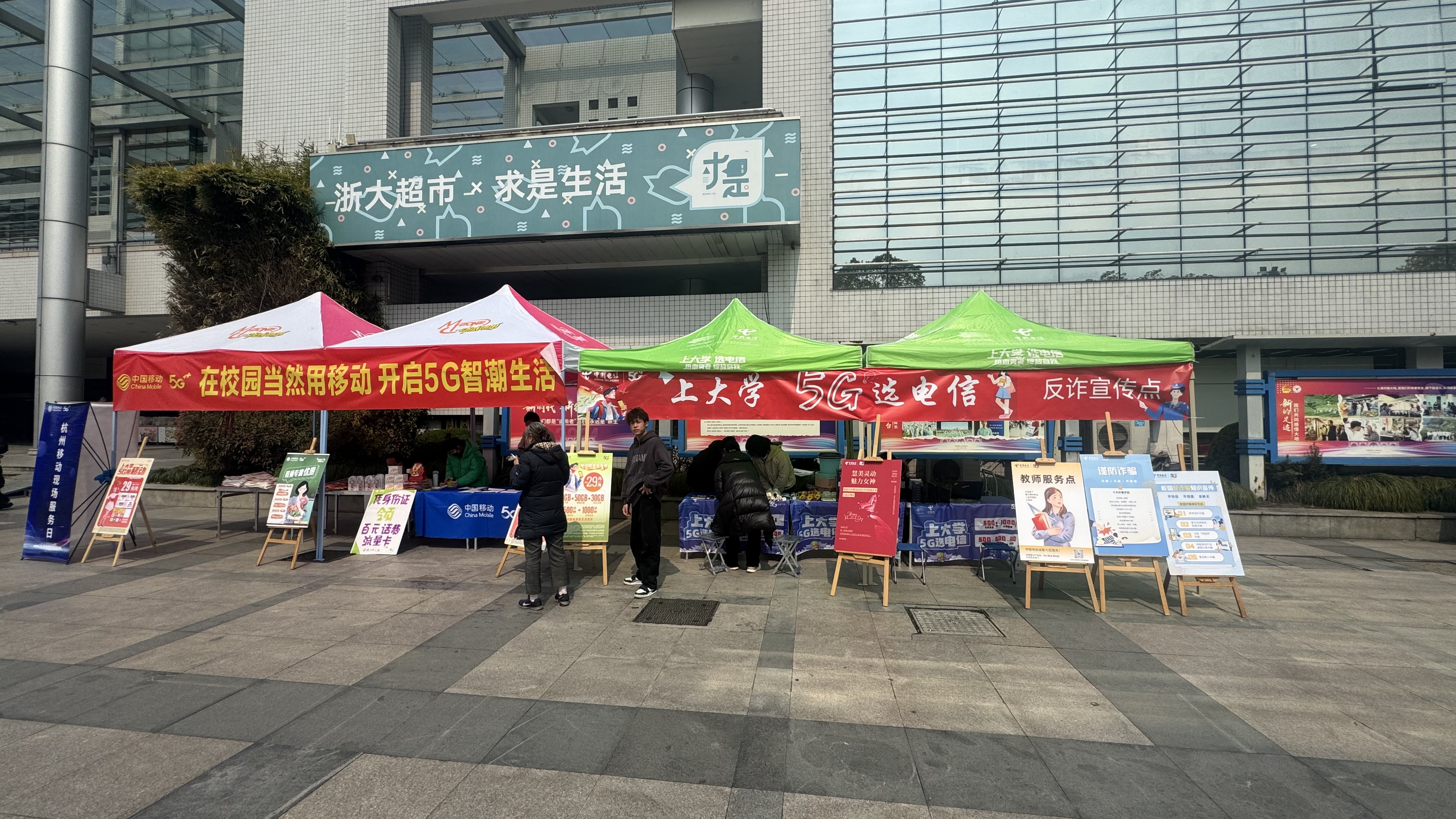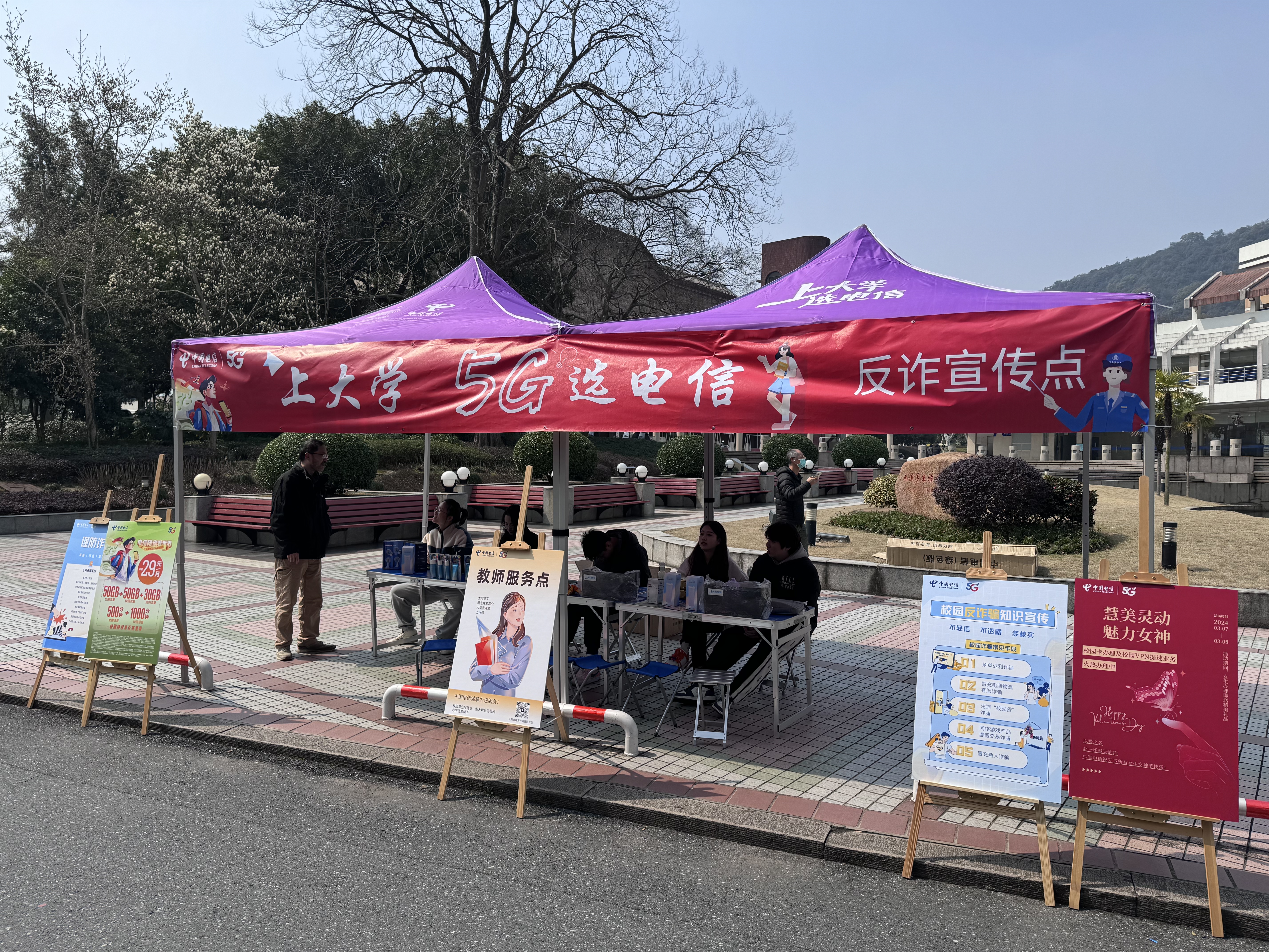 为方便师生办理校园通信服务,进一步提高师生的识骗防骗意识,增强识骗防骗能力,维护学校的安全稳定,3月7-8日,科教中心通信中心联合中国移动、中国电信、中国联通三大运营商在紫金港、玉泉校区增设师生优惠办卡服务点,并开展校园反诈骗知识宣教活动。