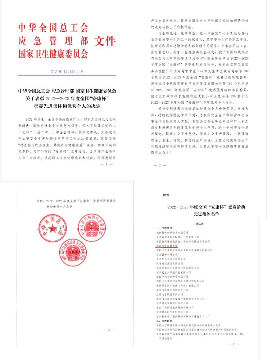 前不久,中华全国总工会、应急管理部、国家卫生健康委员会联合印发了《关于表彰2022-2023年度全国“安康杯”竞赛先进集体和优秀个人的决定》。浙江大学后勤集团紧紧围绕“排查整治安全隐患、共促安全健康发展”主题,积极开展形式多样、内容丰富的竞赛活动,荣获全国“安康杯”优胜单位称号。